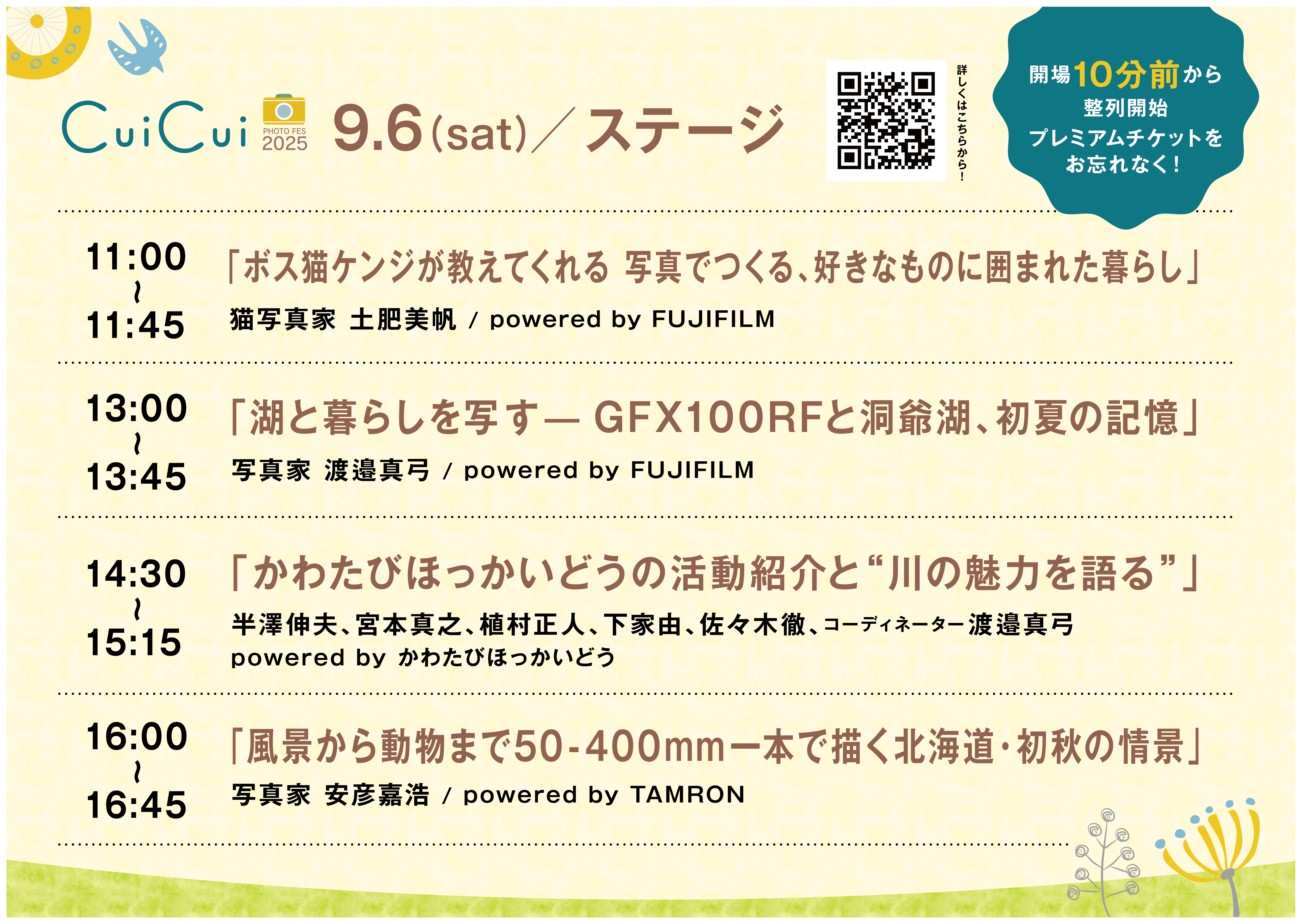 石狩川下流域を中心に撮影された魅力的な写真を見ながら、川の楽しみ方や撮影のヒントを語るトークステージです。登壇者は、日頃から川の魅力を発信している写真家や活動者たち。それぞれの視点で語られるエピソードや、イベント時の写真・動画も交えながら、フォトスポット検索にも役立つ「かわたびマップ」の活用法をご紹介します。写真愛好家のみなさんに、川と写真の豊かな関係をお届けします。